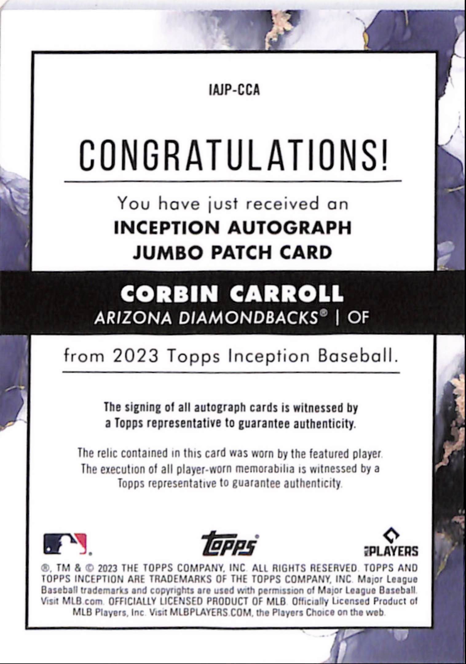 Corbin Carroll 2023 Topps Inception Rookie Patch Auto #49/99