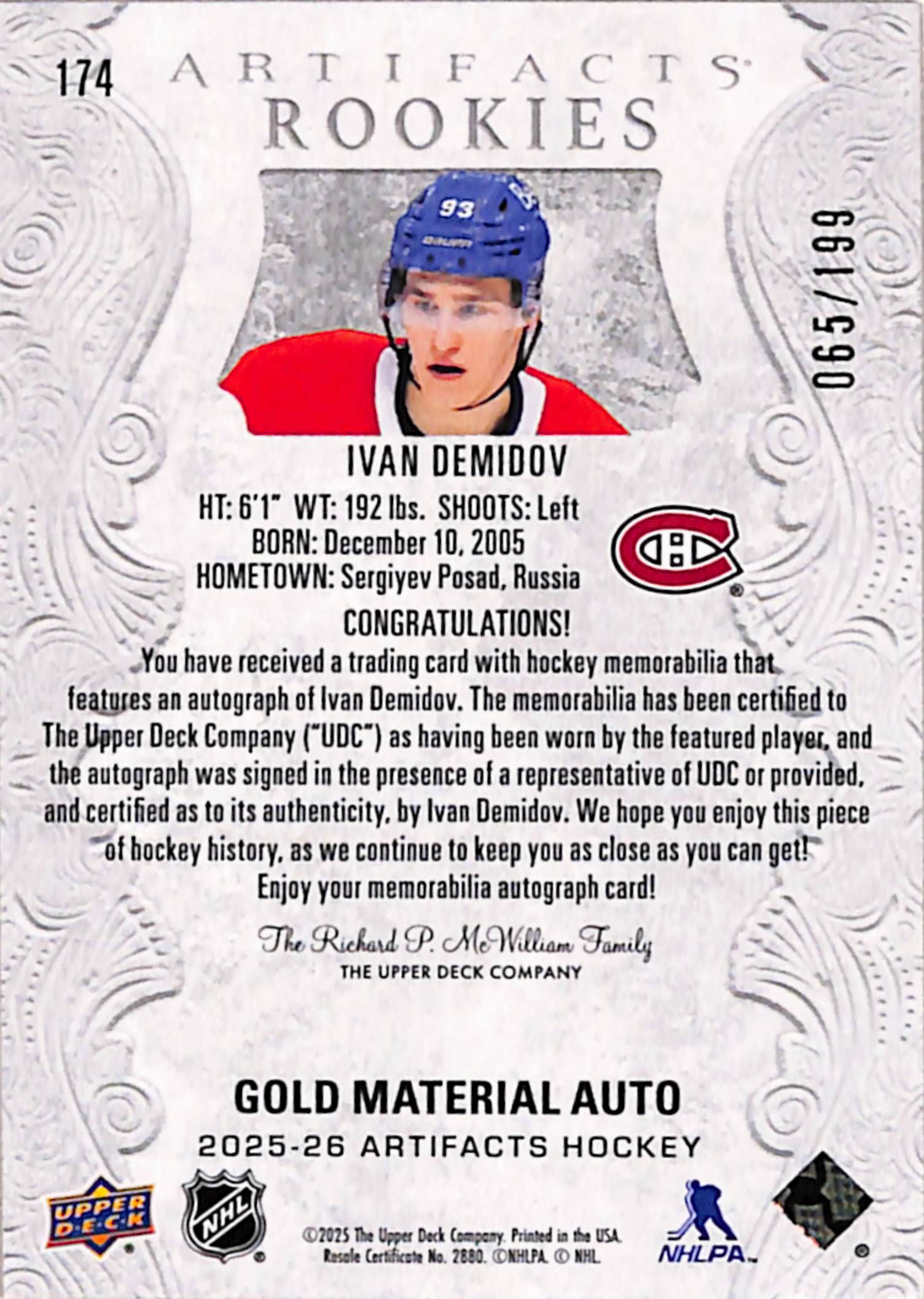 Ivan Demidov 2025 Upper Deck Artifacts Dual Jersey Auto Rookie #65/199